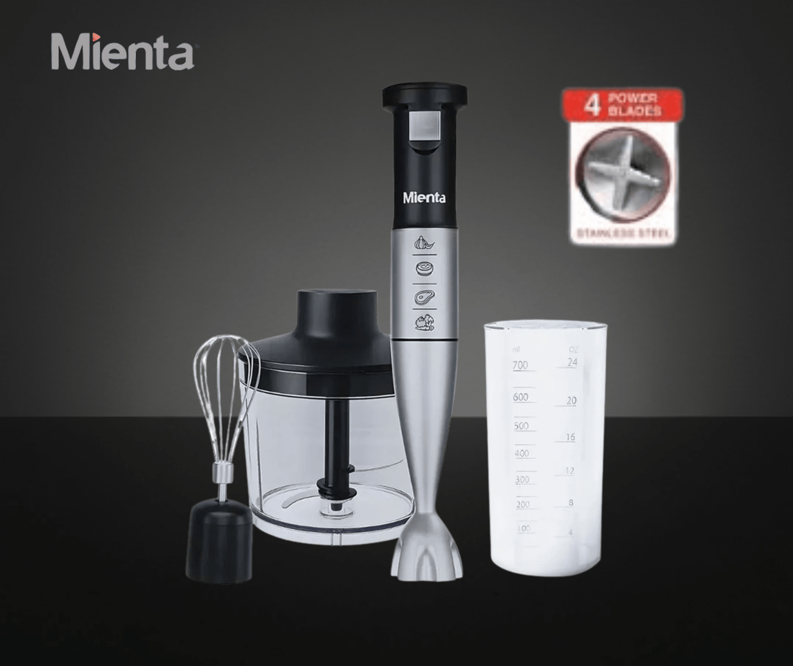 الملحقات: مفرمة (500 مل)، دورق معايرة (700 مل)، ومخفقة ستانلس ستيل.