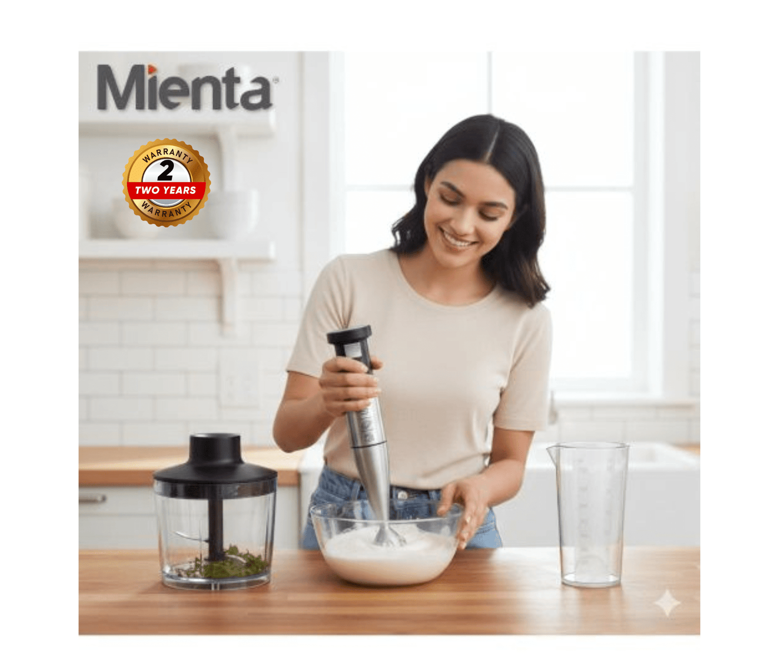 مطبخكِ بالكامل في جهاز واحد بقوة 1000 وات! يُعد هاند بلندر ميانتا (HB111735A) الشريك المثالي لتحضير الوجبات بفضل محركه الجبار بقدرة 1000 وات. يأتي الطقم متكاملاً مع مفرمة سعة 500 مل مزودة بشفرات قوية، ومضرب بيض من الاستانلس ستيل، ودورق معايرة كبير سعة 700 مل. بفضل نظام السرعات المتعددة وذراع الخلط المصنوع من الفولاذ المقاوم للصدأ، يمكنكِ خلط الشوربات الساخنة، فرم الخضروات، وخفق الكريمة بمنتهى السهولة والدقة الاحترافية.