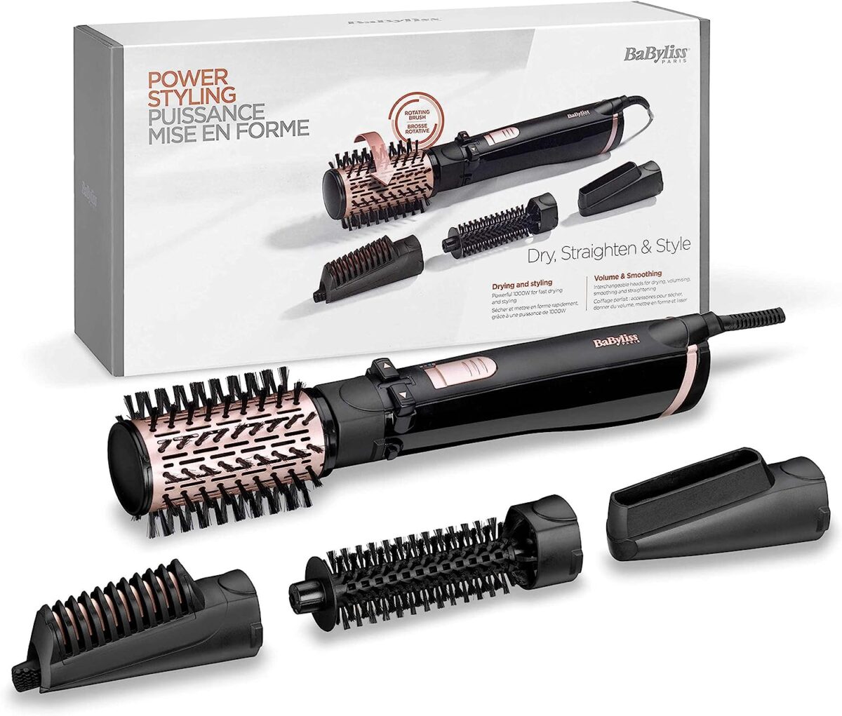| Description | Babyliss Rotating Ionic Hair Straightener Brush – 4 Attachments and Black Bag – 1000 Watt – (International Warranty) |